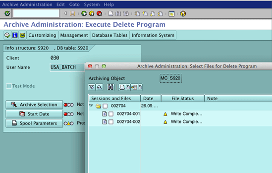 To execute the deletion program to create deletion jobs, execute transaction code SARA and click the Delete button (refer back to Figure 6). In the next screen (Figure 18) click the Archive Selection button. In the pop-up screen select the files that you want to delete by checking the box beside the name of the session. For our example, we can select the 002704-001 check box.