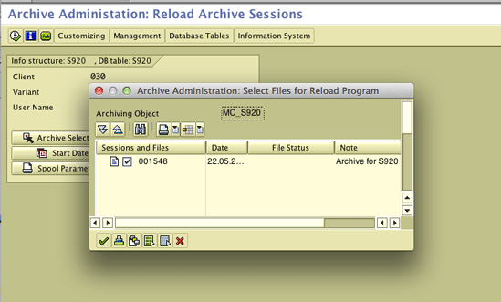 After you save the variant by clicking the save icon, the system returns you to the screen to reload archive sessions (Figure 19). To execute the reload program click the Archive Selection button. A file selection pop-up screen for Archive Administration: Select Files for Reload Program appears (Figure 21).