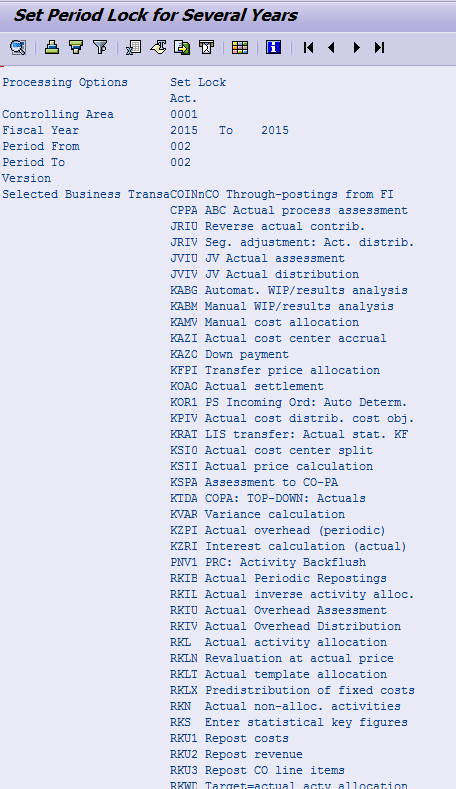 The parameters of the selection screen of program RKCOOKP1_MULTI match the selection screen of the Maintain Period Lock transaction (OKP1). The main difference is the selection of the business transactions. The business transactions are the transactions that you see in the rows of the Change Actual Period Lock: Edit screen (Figure 2). However, instead of the description of the CO transactions, you need to select the codes used for these CO transactions.