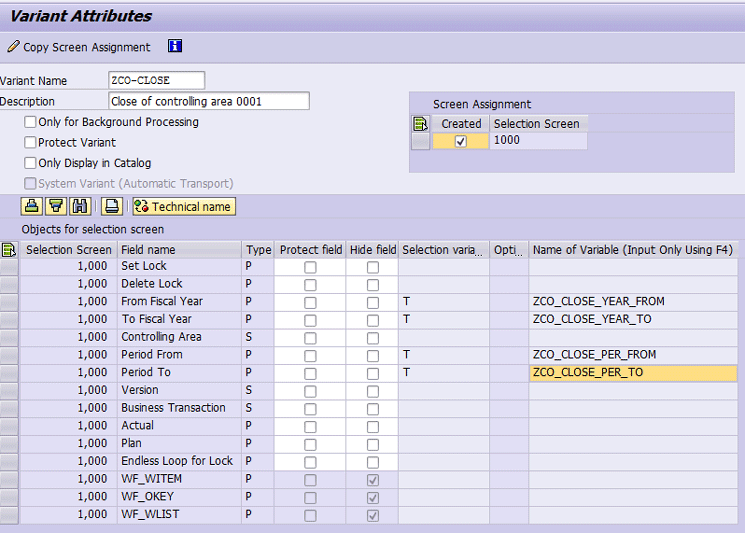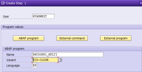 To schedule the program RKCOOKP1_MULTI, you need to define a variant for the program. In this variant all variables except the period and year are fixed. The periods and years differ per period. To make a variable variant, you need to have entries in table TVARVC, which can be used in the variant. It can be handy to use special parameters for the period-end closing, especially if your fiscal periods do not use the Julian calendar.