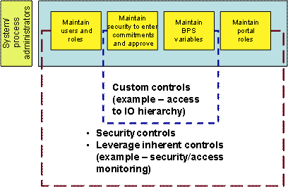 The system administrator had specific tasks to perform relating to the setup of users and providing user access to the planning application, which includes maintaining permissions for various users to view only a portion of the application to which they require access. The former was achieved by creating a role that would allow the assignment of the users to the BPS application and provide the access to the SAP NetWeaver BI portal. The system administrator created users, assigned permissions via transaction code PFCG to those users, and provided access to the users to the SAP portal that was designated as the medium to access the BPS application and reports. SAP provides this type of access and control that allows creation of users and assignment of permissions and calls them delivered controls. As part of the prepackaged application software, SAP delivers the mechanism to create users and maintain permissions in a consistent manner. Figure 3 shows the delivered controls that are standard in the SAP system and the custom controls that system administrators created to manage and maintain BPS.