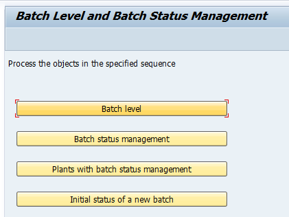To complete this step, follow menu path Logistics General > Batch Management > Specify Batch Level and Activate Batch Management. In the Batch Level and Batch Status Management screen (Figure 1), click the Batch level bar and press Enter.