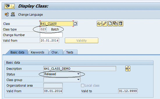 In the screen that appears (Figure 6), enter a name in the Class field (e.g., 641_CLASS), assign class type 023 (provided for the batch by SAP) to your custom class, and click the create icon. In the section below the Basic data tab, enter a date in the Valid From field and add a description of the class in the Description field. In the Status field select Released so that it can be used when it is ready.