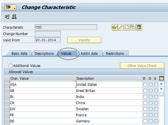 In the next screen (Figure 9), under the Basic data Tab, maintain the Description, Data Type of the characteristic, and the length (Number of Chars) of the characteristic. In the Value Assignment section, indicate whether the characteristic has single or multiple values and if an entry is required for the characteristic. In our example, for the COO, we have a multiple value assignment and it is mandatory to have a value for this characteristic. To configure these settings, go to the Value Assignment section in Figure 9 and select the Multiple Values and the Entry required check boxes. In the Status field make sure the status of the characteristic is Released so that it is ready for use.