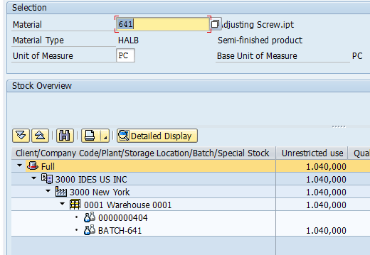 To view the batches assigned to the material go to the Stock Overview screen. To open this screen execute transaction code MMBE. In the Stock Overview screen (Figure 14) you can see the batches created for the material. In our example, BATCH-641 is the external number, and 0000000404 is the number of the batch assigned internally by the system.