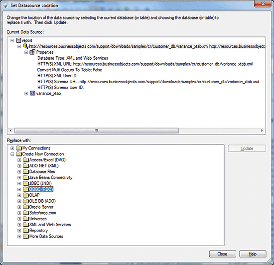 - Update. Click the Update button to replace the data source information in the Current Data Source list with the newly selected data source.