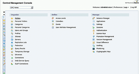 Step 1. Open the CMC of BusinessObjects 4.0. Connect to the CMC with the URL https://{servername}:8080/BOE/CMC. Use an administrator account to log on. The CMC home page opens (Figure 4).