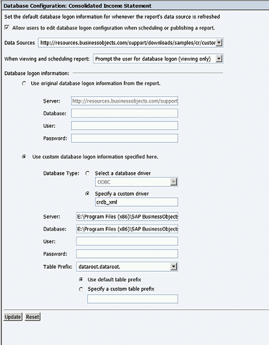 The second option allows an administrator to change the database server to which the chosen Crystal Report is connected. If you select the second option, you can specify a server name (or a data source name in the case of an ODBC data source), a database name, a user name, and a password from a number of predefined database drivers, or from a custom database driver that you select. If you have changed the default table prefix in your database, you can specify a new custom table prefix as well.