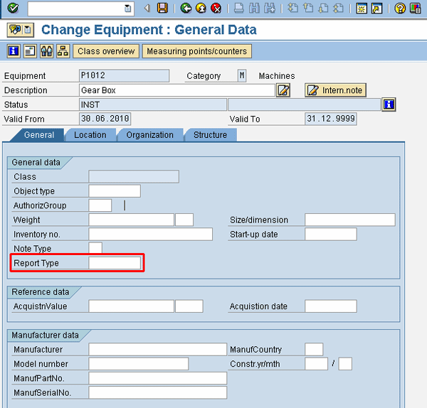 To define a shift report in an equipment entry in PM, follow menu path Logistics > Plant Maintenance > Management of Technical Objects > Equipment > Change or use transaction code IE02 (Figure 9). Enter the equipment number and press Enter or click the enter icon. Assign the previously configured shift report in the field Report Type and save it by pressing Ctrl-S or clicking the save icon (Figure 10).
