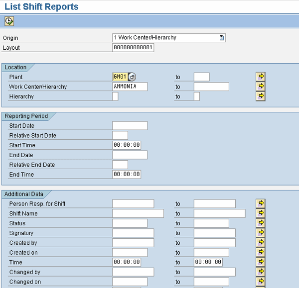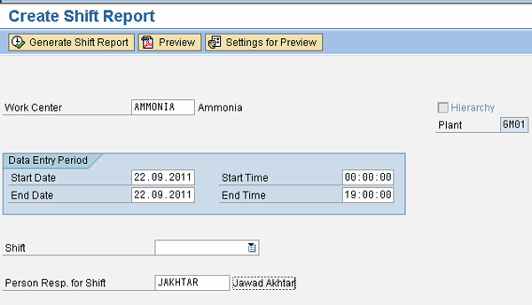 To create a new shift report, follow menu path Logistics > Central Functions > Shift Notes and Shift Reports > Shift Note and Shift Report for Work Centers > Shift Report > Create or use transaction code SHR1 (Figure 13). In my example, I defined the initial parameters; that is, the resource (or work center) as Ammonia as well as the start and end dates of the period from which I want to generate my shift report.