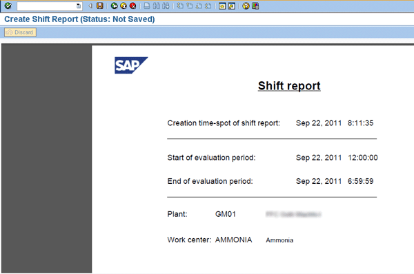 You can generate shift reports for resources, work centers, equipment, and functional locations. You can digitally sign, print, send by email, or even discard these reports if they were created with incorrect information. Shift reports can be generated for a single shift, all shifts in one day, or any other defined period as required by the business.