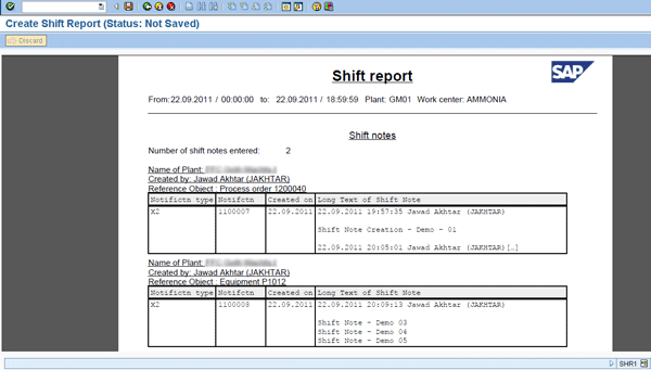 As of SAP ERP Central Component (SAP ECC) 6.0 enhancement package 3 and above, you have the option to record important shift details related to production or maintenance in the form of a shift note. The data from one or more of these notes can be output in the form of a shift report. A shift report can, for example, contain comprehensive details about all the activities and issues that may have occurred during the last three shifts in a 24-hour time period.