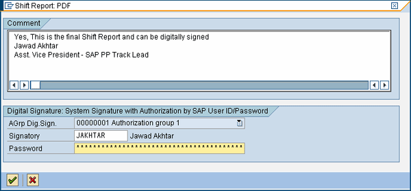 Click the Sign button. In the screen shown in Figure 17 the user is required to digitally sign the shift report by entering his or her SAP log-in and password. Notice that here you can also add comments related to the shift. After entering your SAP log-in and password, either press enter or click the continue digital signature icon