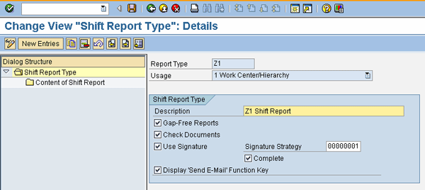 To define a shift type, follow configuration menu path SPRO > Reference IMG (or Press F5) > Logistics – General > Make Settings for Shift Reports > Define Shift Reports Types (Figure 1). Click the New Entries button. In my example, I created the shift report type Z1.