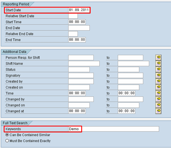 If your Basis team has successfully installed the search engine TREX, then a keyword search in the long text of shift reports is possible. To search shift reports for keywords, follow menu path Logistics > Central Functions > Shift Notes and Shift Reports > Shift Note and Shift Report for Work Centers > List Shift Reports > List Shift Reports or use transaction code SHR4 (Figure 21). Define the parameters of your search here. In my example, I specified that all shift reports starting from September 01, 2011, with the keyword Demo be displayed.