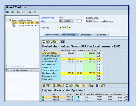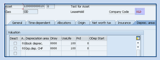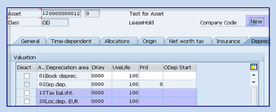 Technically, the system copies the depreciation key, values, and life of the asset from depreciation area 01 (OLD) to depreciation area 15 (NEW), based on configuration under Depreciation areas: Rules for Value takeover and Depreciation Areas – Rules for takeover of depreciation terms.