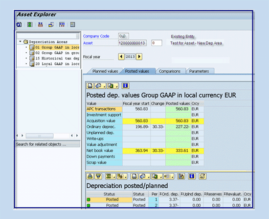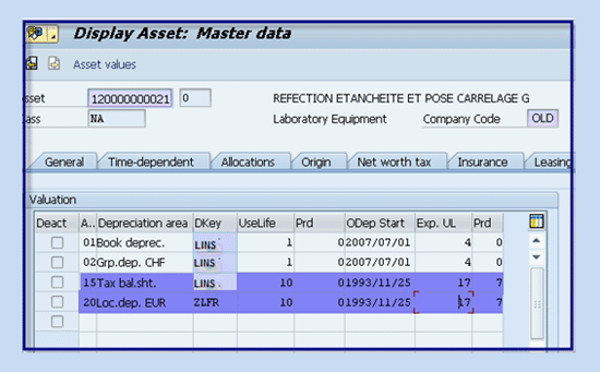 - Depreciation area 15 (historical tax depreciation) is linked to 0 (area does not post) and is used for local tax depreciation and reporting purposes