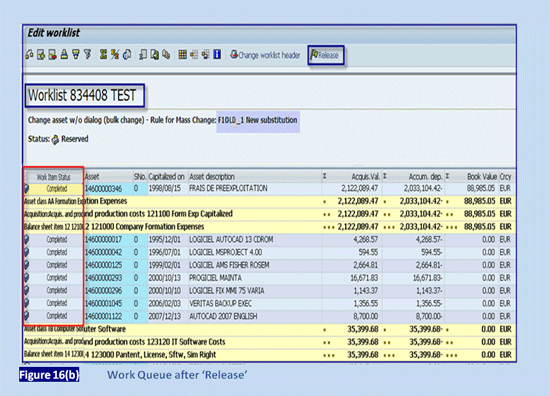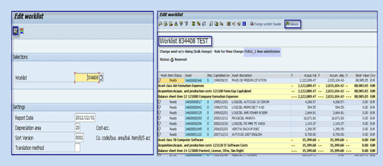 To execute a worklist, follow menu path Accounting > Fixed Assets > Environment > Worklists or use transaction code AR31. The work queue created is used to edit or execute the worklist and release the queue for the same depreciation key to update all the asset masters in the legal entity OLD. To release the worklists, click the release button (Figure 19).