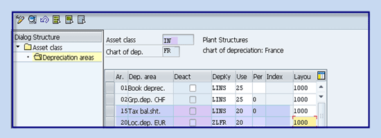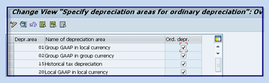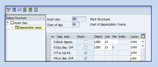 - Depreciation area 20 (local depreciation in local currency) is linked to 3 (area posts depreciation only) along with target group XX (country-specific non-leading ledger)