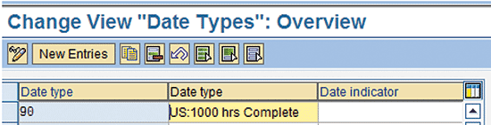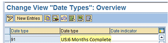 Click the New Entries button. In my example, I create date type 90 for 1000 hours of work. Enter the date type (90 in this example) and, in the second Date type column, the number of hours the employee has to complete to become eligible (1000 hours). Click the save icon to save your new date type.