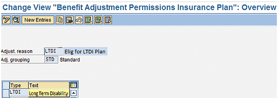 In Figure 3, click the New Entries button, and the bottom part of the screen appears. In the Adjust. Reason field, choose LTDI from the drop-down options (which are based on your previous configuration). In the Adj. grouping field, enter STD (the standard SAP system grouping), and in the Type and Text columns, add the benefit plans that need permission for this adjustment reason (LTDI and Long-Term Disability, respectively). Click the display icon