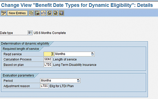 Configure the system as follows as this is required to capture the completion date of the compulsory waiting period. As soon as the employee completes the required waiting period, this date type is populated. In my example, this period is defined as six months from the date of hire. Follow IMG menu path Benefits > Flexible Administration > Program > Employee Eligibility > Dynamic Eligibility > Define Date Types or table V_T548 (Figure 1). Click the New Entries button to create the new date type and then click the save icon