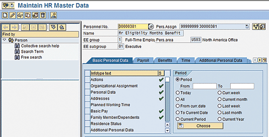 Now you can enroll the employee (30000381) into the plan using transaction code HRBEN0001. Enter HRBEN001 in the command bar (Figure 9). In the benefit enrollment screen (Figure 13) select the benefits for the employee and enroll him.