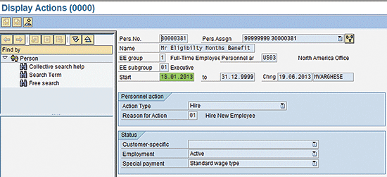 In this step you create a month-based eligibility condition for a new employee (Figure 7). In my example, I hired a new employee via transaction code PA40. Click the action infotype (0000) and you can see the employee’s hire date is 18.01.2013, and he is eligible for the benefit plan after six months of employment, which is 18.07.2013 (Figure 8).