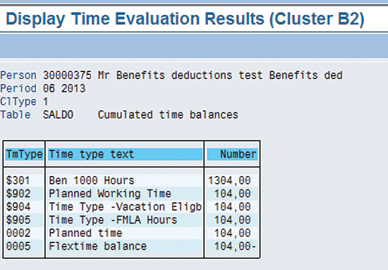 Figure 26 is the time evaluation result for the employee record (personnel number 30000375). It shows that the employee has worked 1,304 hours (1,200 hours that were just added plus an additional 104 hours from the previous pay period). This means this employee is dynamically eligible for the benefit plans.