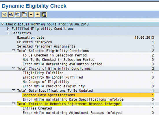 In my example I was able to create the eligibility condition for an employee for each of the conditions because I knew the employee number. In actuality, however, you may need to produce an infotype audit trail report. As a good practice, it’s probably a good idea to create an infotype audit trail report for infotypes 0041 and 0378. Through these reports you can find out for whom infotypes 0041 and 0378 are created for the selected period, and then you can enroll those employees into the benefit plan.