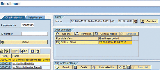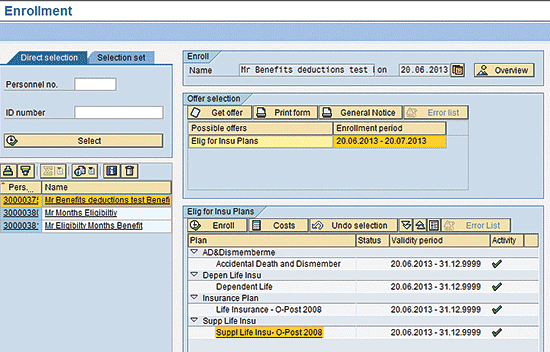 In the Direct selection tab, enter the employee’s personnel number and click the execute icon. This action creates the screen on the right of Figure 13. Click the Enroll button to complete the enrollment of the employee into the plan. The next screen (Figure 14) confirms that the employee is enrolled in the plan.