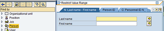 Figure 15 shows you the search screen for the object P. Enter the employee name in the Last name and First name fields, and click the arrows to the right to start the search.