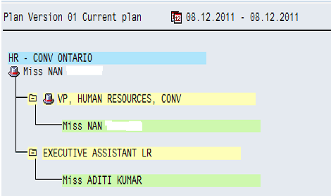 You can view the different structures to which this employee is assigned via transaction code PPOS_OLD. In this example the employee is assigned to three different unique structures simultaneously (Figures 17, 18, and 19): executive assistant to three different executives (Miss Sharon, Miss Nan, and Mr. Dan).