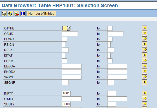 To run an employee holding multiple positions report, use transaction code SE16 and table HRP 1001 (Figure 20). Enter the object type (P), the object ID (PERNR), the infotype number (1001), and the subtype (B008). Click the execute icon