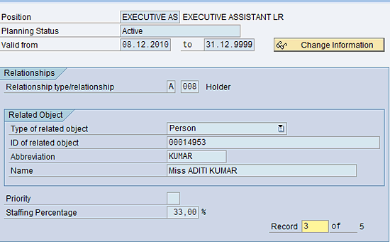 Using relationship A008 you can build the integration between person and position, which is the integration point between OM and Personnel Administration (PA). Through this relationship you connect the employee to the position. After you create this relationship, OM and PA are connected. The holder relationship explains who the holder of the position is.