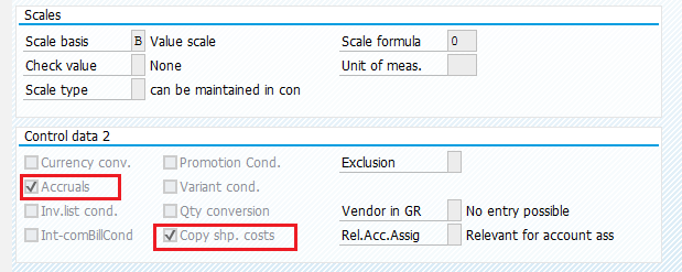 The system shows the Accruals and Copy shp. costs check boxes only if you have chosen delivery costs as the condition type in the Cond. category field in Figure 4.
