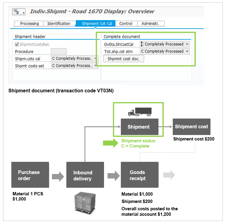 Transportation processing delivery costs can be considered for both standard POs and stock transfer orders. The determined shipment costs are not directly transferred to the accounting department, but are included in the materials management (MM) goods (inbound delivery) receipt document. They are added to the respective material (FI and Controlling [CO]). This scenario is relevant for a company’s internal shipments or for inbound shipments that are picked up from the vendor.