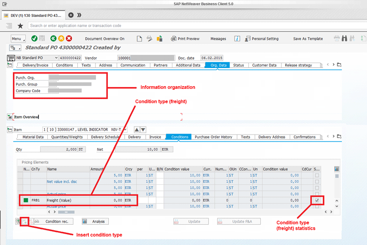 To create the PO (transaction code ME21N), you have to enter the condition type in the item category section. However, you do not enter a value because this value is determined by the shipment cost document and is then automatically transferred to the goods receipt document. The condition type FRB1 is always marked as statistical in the condition screen of the PO regardless of the settings in the price schema because it is an accrual. If you make subsequent changes to the calculation schema that is being used (PO), you must either carry out a new price determination in the existing PO items, or you must delete the affected condition and then add it again, in the order of purchase.