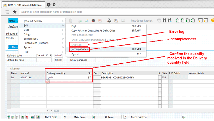The Error Log and Incompleteness options indicate the required fields to complete for creating an inbound delivery