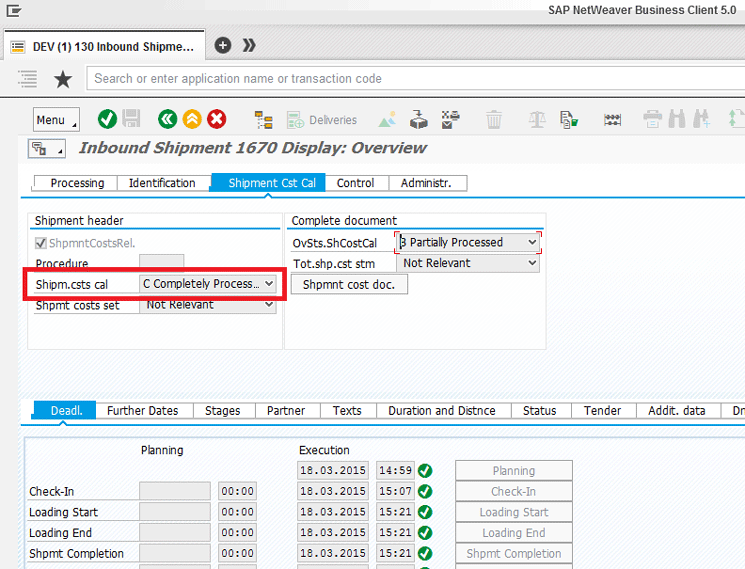 The overall status of the shipment cost calculation for all affected shipments must be C (complete) as shown in Figure 15. If you execute transaction code VT03N, you can see the overall status in the Shipm.csts cal field.
