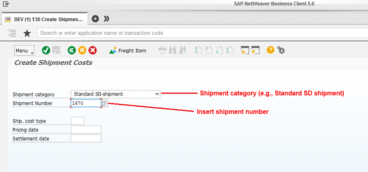 To create inbound shipment costs, execute transaction code VI01 and follow menu path Logistics > Logistics Execution > Transportation > Shipment Costs > Create. In the screen that appears (Figure 16), select Standard SD-shipment from the drop-down list of options in the Shipment category field.