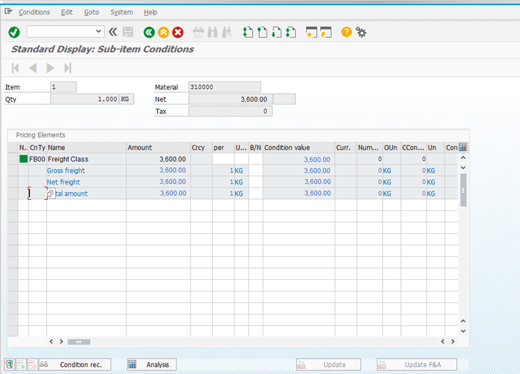 In the next screen (Figure 19), enter FB00 in the row under the Cn Ty (condition type) column and Freight Class in the row under the Name column. Enter the value 3,600.00 in the field under the Amount colum.