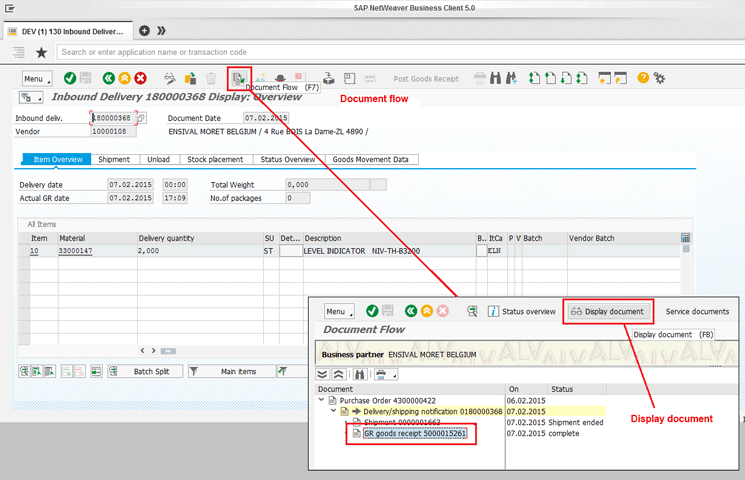An example of the process flow during the development of a goods receipt for an inbound delivery