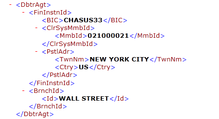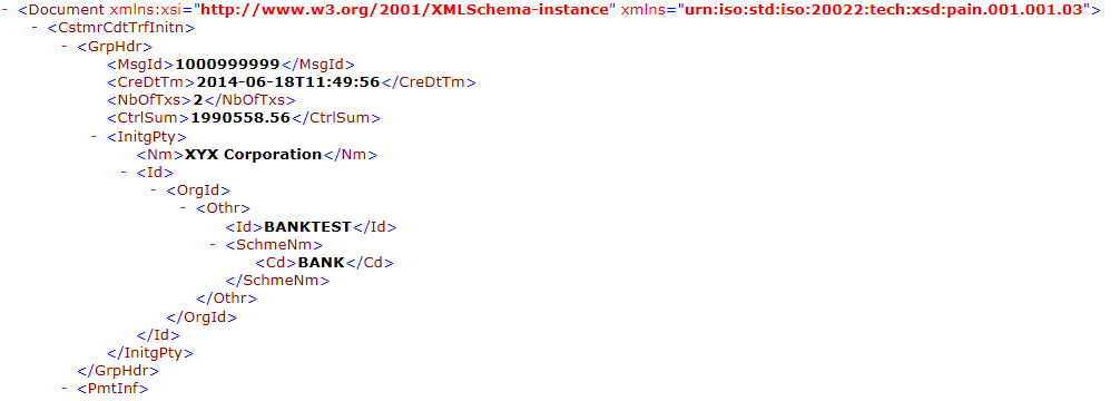 The InitgPty tag contains the information such as name of the initiating part (SAP company code name), customer ID (the customer identification number used by the bank and typically maintained in the SAP house bank customer number field), and a constant (BANK), if requested by the bank. The value BANK is maintained in the SAP DMEE (Data Medium Exchange Engine) tree itself and it can be included or excluded from the output file using conditions based on the bank Bank Identification Code (BIC) or SWIFT code. Figure 2 is an example of the XML code for the group header for pain.001.001.03.