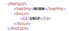 In the InstrPrty (instruction priority) tag, the possible values are either HIGH or NORM. In most cases, the NORM value is used. To maintain these values in the SAP system, execute transaction code DMEE and complete the DMEE tree mapping in the form of atoms used to populate one value versus the other.