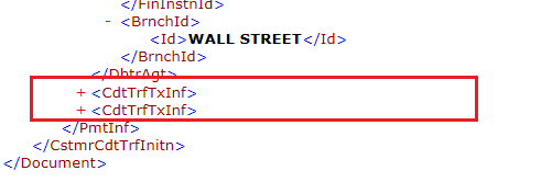 Note that the number of transactions is an aggregation of the number of occurrences of the <CdtTrfTxInf> tag in the file, as shown in Figure 49. For more information on the <CdtTrfTxInf> tag, see the explanation of this tag in the “Payment Information” section.