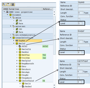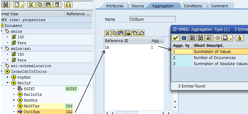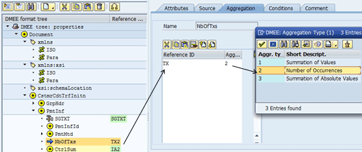 The DMEE offers a number of special functions, such as aggregation. In aggregation, a value related to a reference node is totaled and made available to a different node. In the group header, there are two field values that are determined using aggregation. They are the number of transactions (<NbOfTxs> tag) and the control sum (<CtrlSum> tag). Figure 45 shows both of these fields in the group header.