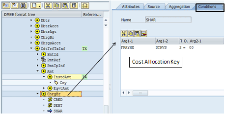 To change the charges indicator tag to be SHAR (shared) for all payments, go to the <ChrgBr> tag in the left panel of the DMEE (Figure 50).