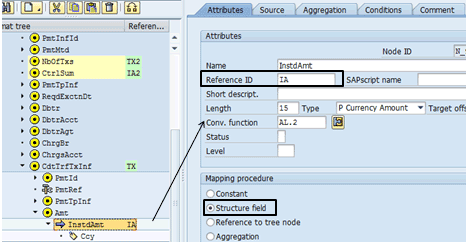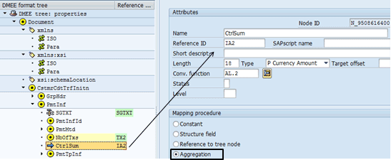 In Figure 43 the Reference ID IA has been assigned to the InstdAmt atom. This is a way for another mapping procedure to use the value of this field, which is done when the total amount of the payments in the file is determined using the aggregation function.