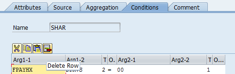 . Select the DEBT atom and click the delete icon. Now you are left with just the SHAR atom. You want to delete the condition on the SHAR atom because now you want SHAR to be the output for this tag for all payments. Select the Conditions tab, place your cursor on the condition, and click the delete row icon